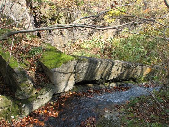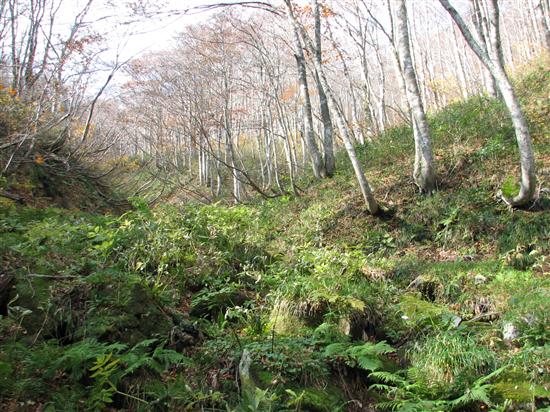9:50稜線上より福島側を臨む。 福島側は山が重なり、山深さだけが際立つ。 9:50振り返って、山形側。 米沢砕石が眼下に見え、米沢市街も一望できる。美しい。 この時「ああ、米沢は盆地だな」と意味不明なことを考えていた。 時折、米沢砕石や国道13号の音が聞こえてくる。 9:50栗子山方面を望む。 雲で隠れている辺りが栗子山であろうか。 まさに山脈といった風景。 9:50足元は藪。 そして、名無しの1202m峰。どっしりとしている。 10:08蛭田氏のレポにもあった手ぬぐい。ここから福島側に下りればよい。 手ぬぐいは、米沢側から登ってきたならば稜線に出て右手に折れればすぐに見つかるはずである。 私はこれが見つけられず、かなり焦った。手ぬぐいには苔が生え、枝の色と同化していたからだ。 焦ると、自分の置かれている立場が良く解った。 こんなところで遭難だけはごめんだ! ふとリュックにしまい込んだままの携帯電話を見ると、電波が入っている(NTTdocomoムーバ)。しかも三本立っている。 急いでdark-RX氏に電話をする。(唐突にすいませんでした) dark-RX氏は蛭田氏レポをメールで送ってくださり、すぐにこの手ぬぐいを発見できた。 それにしても、メールの題名が「栗子の稜線におられる方へ」。 まさに稜線にいた私は、独り爆笑した。 余裕を取り戻した。 ありがとうございました。 (ちなみにこの手ぬぐい、風化しており触ると簡単に千切れた。次回登った時、存在しているかどうか・・・。 赤リボンの方はまだまだ大丈夫そうだった) (追記 2006年10月再訪しました。手ぬぐいのあった場所は山形側へ崩落を起こしごっそり無くなっていました・・) ![]() 10:08ふと上を見ると、空が近く雲がすぐそばを通過してゆく。 先ほどの通話中dark-RX氏から「郡山は快晴ですよ。」と聞いたが、ここは風の通り道。 雲が凄いスピードで福島側へ流れていた。 もうずっと変わっていない風景なのだろう。 稜線上に20分、そろそろ体が冷えてきた。 さあ、福島側を下ろう。 10:16手ぬぐいの場所から、急斜面を滑るように下ると踏跡は右へ続いている。 右へ少し歩くと沢状の地形に出会う。水は流れていなかった。 これを下っていけばいいはずだ。 この辺りで私はペットボトルを紛失した。(アルカリイオンの水だったかな?) 前回の工事軌道合同探索のときのナタ紛失といい、今回のペットボトル紛失といい、何をやっているんだか・・・ 次回行くことがあったら、必ず回収してこよう。 10:16沢地形は稜線から続いているようだ。 ただ、ここを詰めていっても激藪の稜線上に出るだけだろう。 10:21まだ水はない。 足元さえ気を付ければ問題ない。 10:21稜線が遠くなってゆく。 10:26左から水のある沢が合流してくる。 まだまだ流れは小さい。 10:35右手から小さな滝が合流。 どこかで見たような風景になってきた。もうすぐ栗子隧道福島側に着くのか?! 10:41ナメのような地形になり、登山靴で歩くのは危険になる。 私は何度も転びビショビショになった。 谷が深くなってゆく。 10:42左から大きな沢が合流する。 ここはどうしても登山靴では下れず、合流してきた沢まで迂回して下った。 10:48ああ!! 見えてきた! 栗子隧道福島側だ。 10:52ここが一番の難所だった。 山側は崩れていて下れず、隧道側の細いコンクリの上を下りる破目になった。 以前は崩れておらず、赤リボンがあった記憶がある。 お尻を擦りながら無様な体勢で下りた。 10:52流水路から撮影。 やはり栗子隧道は巨大だ。雍壁の石積も美しい。 10:55ここから下りてきた。 10:55今はもう抜けられぬ栗子隧道。 山越えしか手段はない。 10:55さあ、戻ろう。 万世大路の魅力は尽きない。 |