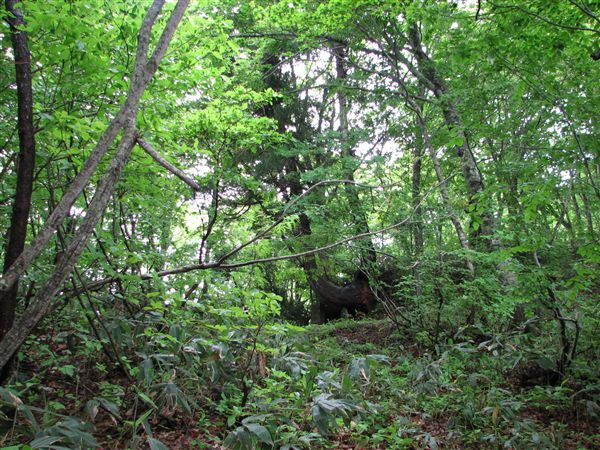 5/20親友T氏と栗子隧道に到達し、T氏は2003年の敗退の無念を晴らした。 その勢いでT氏と6/10再び背坂峠踏破へと旅立った。 かつて砂防ダムまでは、T氏と来ており、その先の満沢鉱山跡へはまるだし氏と来ている。 今回は重機・ダンプが鉱山跡まで入っており、道はきれいに整備され私の2WDの軽自動車でも入ることができた。 ただし、底はするし泥濘がありスタックしないよう気をつけなければならなかった。 背坂峠は太古の昔に出来た向町カルデラの外輪山の窪みに位置し(隣に鬼首カルデラがあり火山地帯であることが解る)、 近世に入り仙台領と最上領を繋ぐ峠道として栄えた。 さらに近代、峠の麓で満沢鉱山が栄えたこともあった。 地元の方曰く、今は殆ど通う人もおらずひっそりとしているという。 長年の夢であった背坂峠にいざゆかん。 ![]() なんと、満沢鉱山跡の終点、背坂峠入口まで車で来ることができた。 相変わらず物凄い藪。 どうも峠道への取り付き口が失われているらしく、我々は写真上部の杉林をまっすぐ突っ切り峠道に取り付いた。 ![]() 峠道は比較的きれいに残っている。 鉱山側は植林杉、山側はぶなと奇麗にわかれている。 味わいのある古道だ。 ![]() きれいな九十九折。一気に標高をあげる。 ここから自分の車が見えた。 ![]() 美しい森。 自然地形のまぎらわしい偽分岐があり、ちょっと怖い場所であった。 ![]() 背坂川の源流付近斜面へ出ると、日を浴びた植物たちの大歓迎を受ける。 ぐえー。 ![]() 藪に埋もれるT氏。ここが一番酷かった。 相変わらずの軽装。鈴やナタは私が先頭で振るっている(^-^;; ![]() 先に森が見えてきた。 やっと藪ともおさらば。 ![]() 森の中には切り通しが残されていた。 このあたりにはギンリョウソウが多く生えていた。 ![]() 人馬がこの切りとおしを通ったかと思うと感慨深い。 ![]() その先は穏やかな古道となる。 美しい原生林。 ![]() このあたりも偽分岐がありちょっと迷った。 迷ったときは必ず地図を確認する。 ![]() これは切り通しというよりか、雨に洗われたというべきか・・・ 通り抜けに難儀した。 ![]() 再び藪。 森が切れると藪になる。 ![]() ぶなの巨木に出会う。 根元は空洞化が進んでいたが、枝には新しい葉をつけていた。 この峠道をずっと守ってきたのだろうか。 ![]() 再び美しい古道へ変わる。 ため息の出そうな美しさだ。 ![]() そして、遂に到着。 背坂峠だ! ![]() 峠には馬頭観音とお地蔵さんが居る。 杉の巨木に守られる姿に感動する。 お地蔵さんは日本人の優しさがよく表現されているような気がする。 ![]() 馬頭観音と石碑に刻まれている。なんと安政二年のものらしい。150年程前のものだ。 安政二年(1855年)といえば安政大地震や日露和親条約調印の年である。 東京都青梅市の松ノ木峠にもあったが、古い峠には馬頭観音の石碑がよくある。 末永く残って欲しい。 ![]() 横からみるとこんな感じ。杉が覆いかぶさっている。 一番奥のお地蔵さんは体が無く、石を二段積んだ上に頭が置かれている。 嵐で流されてしまったのかな? 置いた人の心が伝わるようだ。 ごみは一箇所に片付けられていた。本名荒井さんがやってくれたのかな? お金が散らばっていたので、拾って石碑の前に置いた。 大休止を挟んで、来た道を戻ることにした。 いやはや、素晴らしい道であった。 ![]() ぶなの巨木の辺りから、最上町が一望できた。 まさにカルデラだ。 ![]() 無事生還。少なかったがすでに虻が発生していた。 すばやく着替えて脱出。 ![]() 車を止めた場所から最上町を望む。 背坂峠は、また訪れたい場所のひとつに加わった。 |