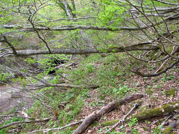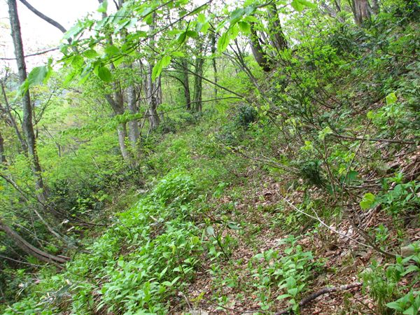 明神峠を踏破した我々は、二ツ小屋隧道の稜線上にある四等三角点を目指して万世大路福島側へ向かった。 国土地理院の基準点成果等閲覧サービスを見る限りでは、2003年10月に三角点の存在を確認しているようだ。 我々も行けそうではないかとdark-RX氏と相談し、まずは二ツ小屋隧道福島側の脇から登ることに。 ![]() 東栗子トンネル脇。相変わらず取り付き口は道が荒れている。 ![]() マムシ草を眺めたり山菜を探しながら歩いていたら、熊避け鈴をたくさん付けた青年に抜かれた。 若い衆は動きがええの〜、と思っていたらなんとたつきさんだった。 なんという偶然。隧道上で挨拶をかわすなんてなんてありえん・・・ 我々は隧道に入らず、写真左手前へ。 ![]() 行く先の様子が怪しい。 激藪だ。 ナタを準備するdark-RX氏。 ![]() 道のような、道でないような・・・ この後、とんでもない密林地帯に入り遭難の危険を感じたのでそそくさと撤退。 すでに点の記にある小径は消え去っていた。 こうなったら二ツ小屋隧道の反対側から元作業道を歩いて稜線に向かい、稜線上を歩いた方が良さそうだ。 ![]() ![]() ![]() 二ツ小屋隧道の穴はさらに広がっていた。 こりゃぁ長くはないな・・・と毎年言っているような気がする。 ![]() 隧道脇から元作業道へ向かう。 この作業道では昭和9年に死者がでている。 鉄管を担いでこの作業道を通ろうとした者が高圧電線に触れ感電して亡くなっている。 この時期の高圧電線はまだ3300Vだったが、今のものは6600Vである。 また現在ではポリエチレン被覆線を使っているが、この時代は裸線であったのだろうか。 いずれにせよ作業員の安全が第一でない時代だったようだ。 ![]() 隧道の大穴を上から見る。 体重の軽い者でも踏み抜きかねない。落ちたら骨折するだろう。 ![]() 坑口を裏から撮影。 何度見ても巨大で息を飲む。 ![]() 作業道は隧道内に流れ込む沢に沿って比較的明瞭に残っている。 ![]() 新緑の美しさに言葉も出ない。 ![]() 登ってきた米沢側坑口方面を望む。 ![]() 何度か九十九折があり稜線に到達。 福島側の視界は開けない。 二ツ小屋峠とでも呼ぶか? ![]() 一休みしてから四等三角点に向かって藪を登り始める。 先ほどの明神峠の疲れがではじめる。 二人とも汗だく無言。 おまけにアブがたかる。 足が言うことを聞かない。 ![]() 結局、四等三角点は発見できなかったが、それらしき場所にたどり着いた。 ここより高い地点は周囲に無く、おそらく三角点は残雪か落ち葉に埋もれているのだろう。 dark-RX氏は疲労困憊で座り込んだ。 自分もへとへとで、座ろうとして周囲を見回してギョっとした。 1965年 6月7日 S.S と読める。 1965年というと昭和40年・・・40年以上前だ。これを刻んだ人はまだ存命だろうか。 ちなみに翌昭和41年には東栗子・西栗子両トンネルが開通し、二ツ小屋隧道を含む万世大路は旧道へ転落している。 ![]() 二ツ小屋峠への帰りも難渋した。 疲れて足が上がらない。 転げるように歩いた。 ![]() ようやく峠が見えてきた。 ![]() 峠から福島側の下りは明瞭ではない。 恐らく福島側からの取り付き口が失われてしまった為だろう。 ![]() 自然地形とも道跡ともとれる怪しげな道が続く。 道や地形にこだわらず強引に下っていったら万世大路と合流した。 たつきさんはもう山を下っていた。 四等三角点の発見には至らなかったが、新たな出会いもあり充実した探索となった。 歴史に思いを馳せながらdark-RX氏と歩く栗子山中は毎回楽しい。 今後ともよろしくお願いしますm(_ _)m |
