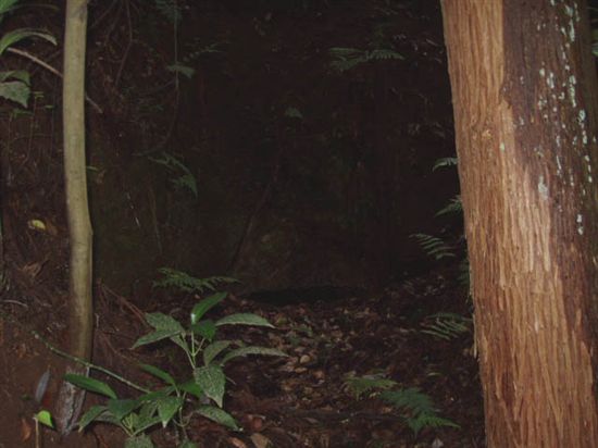 高麗神社へ到着し、方々を物色するもそれらしき道はない。 事前情報無しはやはりキツイ。 近隣で聞き込みを開始し、オートショップのおっちゃんから「多分あそこだろう。」という情報をいただいた。 向かった先で我々が見たのは・・・・ ![]() おいおい・・・・・普通の家じゃないか!! 教えていただいた道を歩いていたら、いきなり私有地の様なところへ迷い込んだ。 でも、この道の広さ、なんか怪しいなぁ。 ![]() 道はとある家の駐車場に繋がっており、さらにその脇のビニールハウスの脇から藪道が続いていた。 藪に突入してすぐ現れる池。 「この池で遊ばないでください」という古びた看板があった。 ![]() ![]() でかい蜘蛛の巣を払いつつ藪漕ぎをしながら左右を見ると、井戸のようなものが点在している。 鉱山関連のものだろうか? ![]() 5分くらい歩くとマンガンのズリが現れる。 地面に撒かれたようだ。なぜ山になっていないのか不思議に思った。 我々はこれを見て、「結構近くに旧坑があるのでは。」と思ってしまった。 つらい藪漕ぎは、ありもしない妄想をさせるものだ。 ![]() 歩けども歩けども旧坑は無い。谷はどんどん狭くなる。 藪は益々酷くなるが、かといって歩けない程密度が濃いわけではない。 奥へ奥へと誘われる典型的な廃道。 精神的にやられてくる。 と、突然藪道が二股に分かれた。 どっちだ・・・・・・・? 左には電信柱の成れの果て(上の写真)と思われるものがある。右は再び藪道が続く。 左はすぐに激藪となり前進不能となった。 我々は右へ進路をとった。 これは正解であった。 左の広場には、鉱山事務所があったそうだ。 この道の入り口にあった家の御主人が大宮鉱山の現役時代をご存知であった。 我々が目指している旧坑は明治か大正時代のものであり、昭和に入るとこの近辺で階段状に露天掘をしていたそうである。 露天掘の跡は埋め戻されたとのことであった。 ![]() しばらく藪を漕ぐと再び広場が現れた。 ここが露天掘りの跡地か? とにかく、蚊と蜘蛛の巣がうざい。蜘蛛でかすぎ。 二人とも精神的に参ってきた。 まだなのか、旧坑はまだなのか・・・。 そういえば、マムシ注意の看板があったな・・・・・ ![]() やけくそで歩いていると、沢の中に台車と思われる残骸を発見。 まさか手動で鉱物を運んでいたのか・・・ ![]() ふぅ。 行けども行けども逝けども藪。 好き好んで歩いてる我々はただの変態である。 ![]() 谷が狭まり、気がつくと沢が無くなっていた。 杉が生えてはいるが、不自然な平地であることに気づく。 怪しい・・・。 ![]() まるだし氏が古いビール缶を発見。 こんなビール見たことない。 ![]() ビール缶が他にもないか下をみていたら、この地表はみなマンガンのズリであることに気づいた。 これは、旧坑が近いに違いない!! ![]() なんとなく、この先が怪しいと思った。 ![]() 藪を掻き分けてみると、当たりであった。 これが明治大正期の坑口であろう。 殆ど埋まっている。 ![]() 振り返ると、ただの森。 その先に見えている藪も酷い。 こんな場所を好き好んで歩く我々は変(略・・・・ ![]() ![]() 坑口へ接近し写真を撮っていると、岩盤の表面でなにかが大量に蠢いている。 うげぇーーーーーーーーーーーー べ、べ便所コオロギだ!!! うげぇ・・・・・・ 私、便所コオロギ駄目なんです。ゴキブリは大丈夫なのに・・・ 結局、内部へ下りることなく撤収。 帰宅して気づいたのだが、このサイトの写真が唯一ネット上にあった写真だが我々が見たものとは違う。 まだ違う坑口があるというのか! 藪の無くなった頃、再調査に行きます・・・・ 大宮鉱山跡に通じる藪道入り口に住むご老人は、大宮鉱山が現役の頃をご存知で我々に色々な知識をもたらしてくれた。 ・大宮鉱山に自宅前の土地を貸し、道として使わせていたこと。(一枚目の写真の砂利道のこと)やはり、古老の知識は的確である。 |