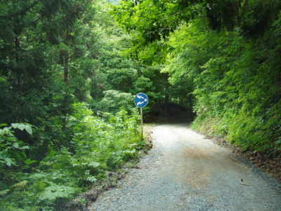 | 隧道を出ると、左に直角カーブ。 カーブの角にこんな看板が。 ここから鶴子林道が始まります。 |