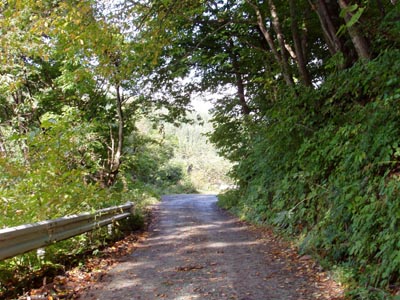 今回は尾花沢側から登った。 登り始めてすぐ、ガードレールのある場所。 道は8月訪問時には舗装されていたが、 何らかの理由でアスファルトをひっぺがしたのか、 それとも簡易舗装が既にダメになったのかは定かではないが ほぼダートに戻っていた。 謎である。 |