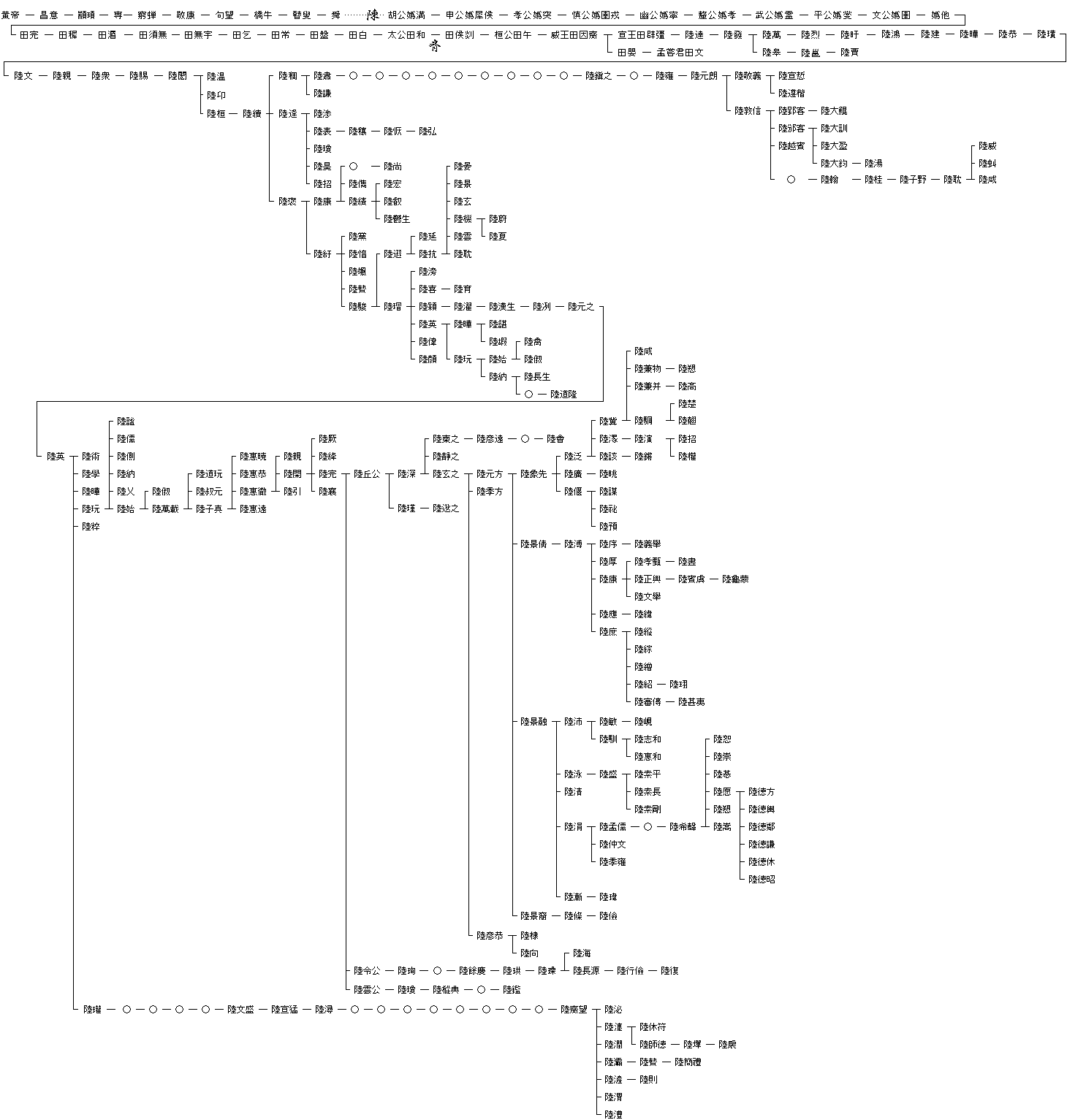 陸家系図、さらに唐代(!)まで延びております。 出展は『新唐書』卷七十三下 表第十三下 宰相世系三下です。 相変わらず、真偽のほうは不明。他家の宰相世家表が胡散臭いし・・・。 |