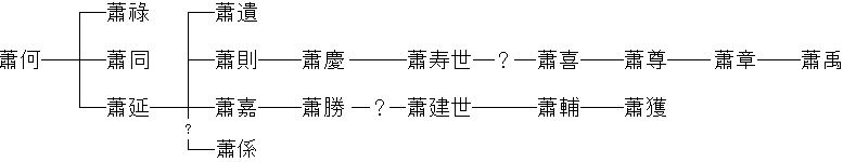 恵帝2年、蕭何が死んだ。おくりなは文終侯であった。 蕭何の墓は、劉邦の墓である長陵のすぐ近くにあったという。 また、曹参の墓とも近かったという。 子の蕭禄が跡を継いだが、6年して死んだ。おくりなは哀侯。 蕭禄には男子の跡継ぎが無く、危うく 呂后は禄の弟の蕭同(注@)を取立てて跡継ぎとした。 また、蕭何の末子である蕭延を築陽侯(注A)に抜擢した。 注@:『史記』高祖功臣侯者年表第六では、蕭同は蕭禄の弟とされているが |