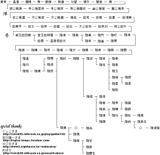 これもぐっこさまのサイトに投稿したネタです。 『三国志』でも『三国志演義』でも有名な陸遜の一族についてちょっと調べてみました。 『後漢書』を探すと、これもザクザク祖先が出てきます。 では、いってみましょう。 陸 会稽郡呉県の人。建武年間(AD25〜AD55)に尚書令になってます。美男子だったようで、越の布単衣を着て、光武帝に気に入られたそうな。陸賈の子孫かなんかですかね? その孫が陸續(字は智初)。 故郷の会稽郡郡守尹興の下で貧民救済してます。そのとき粥を振舞った600人以上の人の名前を覚えていたとか。楚王劉英の謀反に連座し拷問され、皮膚は剥げ肉は爛れたが証言を変えず、結局母の「真四角の肉・一寸の葱」の差し入れで孝行者として赦免される。一生仕官できずに老衰死。 續の長男が広陵郡太守陸稠、 次男が楽安郡太守陸逢、 末子が陸褒。 陸褒は学を好み孝行者。名誉を捨て、志を貫き一生仕官せず。 褒の子が陸康(字は季寧)。 義烈を称され臧旻に茂才に推挙され高成県令になる。武陵太守・桂陽太守・楽安太守と、後の孫呉の重要都市の太守に就任。銅人を造ろうとして百姓への増税を図る霊帝を上疏して諌め、大不敬罪を劉岱によって救われるが、故郷呉へ強制送還。後に廬江が、賊の黄穰らと江夏異民族連合10余万人で大変なことになったので、陸康は廬江太守に任命され悉く賊を降す。その功績で孫の陸尚は郎中に。 その後、袁術が寿春で飢え陸康に食料援助を頼んだときに断った為、袁術配下武将の孫策に攻められる。陸康は2年間篭城するも、70歳で病死。城は落ち、一族百人以上が餓死・病死。朝廷は彼の節義を憐れみ、子の陸儁を郎中に任命しています。末子の陸績は先に城から落ちていたために助かっています。 陸績、一族の陸遜、その弟陸瑁の事跡は『三国志』に詳しく載ってます。 と、ここで続報!!!! NOBさまと玉川雄一さまが、有力な情報をもたらしてくださいました。 そこで、管理人はペイントを酷使して陸家系図を作ってみました。お二方には感謝感謝でございます。 m(_ _)m 追記:この系図は、真実かどうかわかりません。『史記』でも記載が混乱しており、『陳留風俗傳』と『陸氏譜』では大きく記載が異なります。陸一族の自称かもしれないのであしからず。 ![]() 間違いがあったら、こっそり教えてくださいね。(^-^;; NOBさま、追加情報サンクスです♪ 無断転載はNGっす。 |